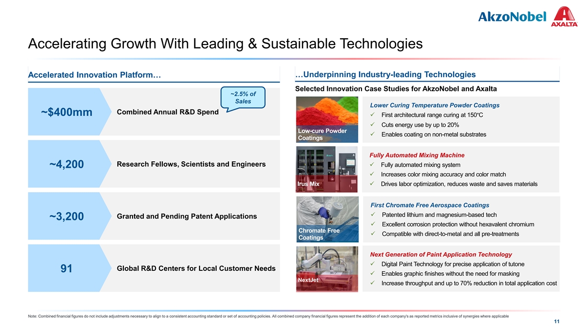 COLOR PALETTE Text 50 56 62 Accelerating Growth With Leading & Sustainable Technologies Title bar/Bullets 0 81 146 ACCENTS 0 109 Accelerated Innovation Platform… …Underpinning Industry-leading Technologies 81 190 1 146 255 Selected Innovation Case Studies for AkzoNobel and Axalta 205 255 ~2.5% of 0 133 2 Sales 10 139 Lower Curing Temperature Powder Coatings 0 130 Combined Annual R&D Spend ~$400mm 139 218✓ First architectural range curing at 150°C 3 197 255 ✓ Cuts energy use by up to 20% 246 251 Low-cure Powder 137 208 4 ✓ Enables coating on non-metal substrates 32 166 Coatings 122 202 183 227 5 Fully Automated Mixing Machine 66 178 168 233 Research Fellows, Scientists and Engineers ✓ Fully automated mixing system ~4,200 38 156 6 154 224 ✓ Increases color mixing accuracy and color match 30 146 Irus Mix✓ Drives labor optimization, reduces waste and saves materials 124 213 Hyperlink 153 234 0 98 Followed 80 205 First Chromate Free Aerospace Coatings Hyperlink 117 255 ✓ Patented lithium and magnesium-based tech Granted and Pending Patent Applications ~3,200 TABLE ✓ Excellent corrosion protection without hexavalent chromium 50 Chromate Free Lines 56 ✓ Compatible with direct-to-metal and all pre-treatments 62 Coatings 0 Highlights 81 Next Generation of Paint Application Technology 146 ✓ Digital Paint Technology for precise application of tutone Global R&D Centers for Local Customer Needs 91 ✓ Enables graphic finishes without the need for masking NextJet ✓ Increase throughput and up to 70% reduction in total application cost Note: Combined financial figures do not include adjustments necessary to align to a consistent accounting standard or set of accounting policies. All combined company financial figures represent the addition of each company's as reported metrics inclusive of synergies where applicable 11