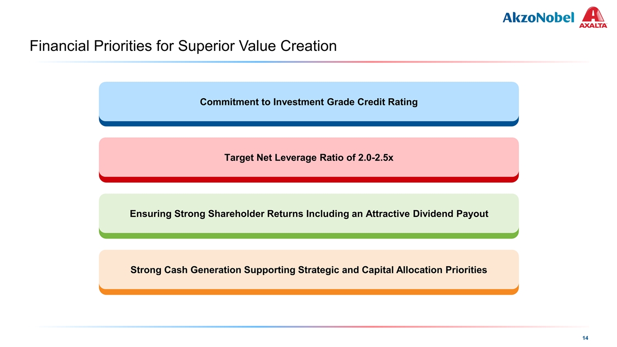 COLOR PALETTE Text 50 56 62 Financial Priorities for Superior Value Creation Title bar/Bullets 0 81 146 ACCENTS 0 109 81 190 1 146 255 205 255 0 133 2 Commitment to Investment Grade Credit Rating 10 139 0 130 139 218 3 197 255 246 251 137 208 4 32 166 122 202 Target Net Leverage Ratio of 2.0-2.5x 183 227 5 66 178 168 233 38 156 6 154 224 30 146 124 213 Hyperlink 153 234 0 98 Followed Ensuring Strong Shareholder Returns Including an Attractive Dividend Payout 80 205 Hyperlink 117 255 TABLE 50 Lines 56 62 0 Highlights 81 146 Strong Cash Generation Supporting Strategic and Capital Allocation Priorities 14