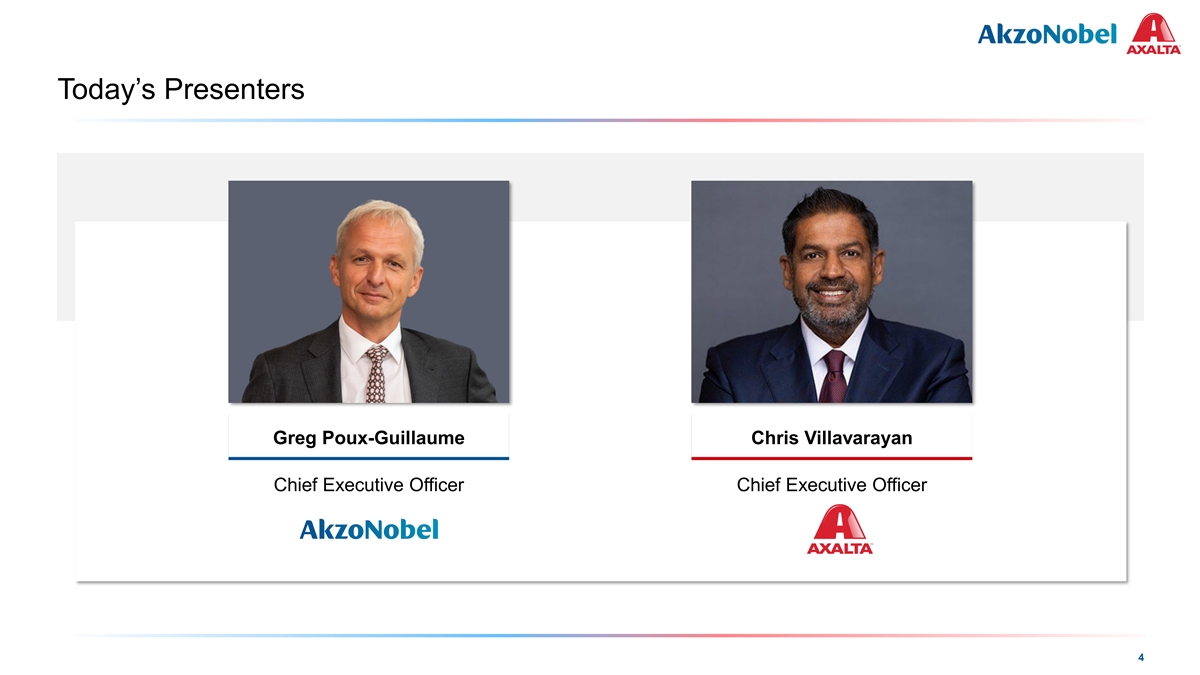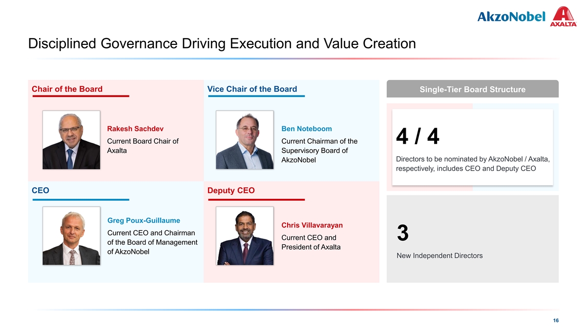 COLOR PALETTE Text 50 56 62 Disciplined Governance Driving Execution and Value Creation Title bar/Bullets 0 81 146 ACCENTS 0 109 81 190 1 146 255 Chair of the Board Vice Chair of the Board Single-Tier Board Structure 205 255 0 133 2 10 139 0 130 139 218 3 197 255 246 251 Rakesh Sachdev Ben Noteboom 137 208 4 32 166 Current Board Chair of Current Chairman of the 4 / 4 122 202 183 227 Axalta Supervisory Board of 5 66 178 Directors to be nominated by AkzoNobel / Axalta, AkzoNobel 168 233 38 156 respectively, includes CEO and Deputy CEO 6 154 224 30 146 124 213 Hyperlink 153 234 CEO Deputy CEO 0 98 Followed 80 205 Hyperlink 117 255 TABLE Greg Poux-Guillaume Chris Villavarayan 50 Lines 56 Current CEO and Chairman 62 Current CEO and 3 of the Board of Management 0 President of Axalta Highlights 81 of AkzoNobel 146 New Independent Directors 16