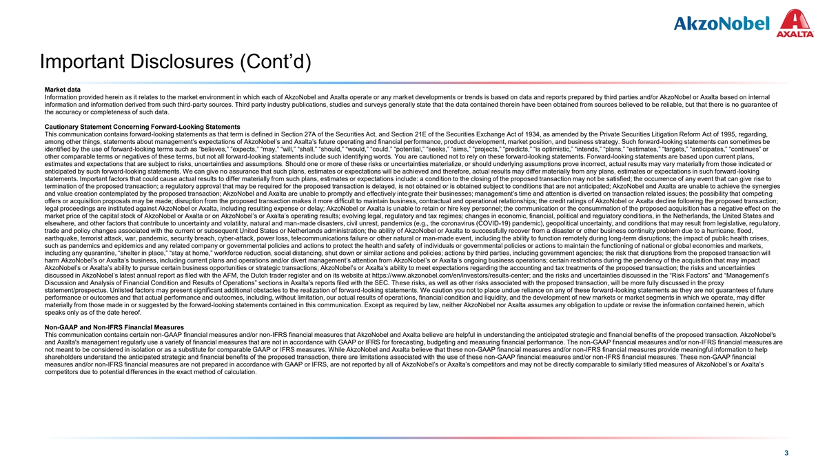 COLOR PALETTE Text 50 56 62 Important Disclosures (Cont’d) Title bar/Bullets 0 81 146 Market data ACCENTS Information provided herein as it relates to the market environment in which each of AkzoNobel and Axalta operate or any market developments or trends is based on data and reports prepared by third parties and/or AkzoNobel or Axalta based on internal information and information derived from such third-party sources. Third party industry publications, studies and surveys generally state that the data contained therein have been obtained from sources believed to be reliable, but that there is no guarantee of 0 109 81 190 the accuracy or completeness of such data. 1 146 255 Cautionary Statement Concerning Forward-Looking Statements 205 255 This communication contains forward-looking statements as that term is defined in Section 27A of the Securities Act, and Section 21E of the Securities Exchange Act of 1934, as amended by the Private Securities Litigation Reform Act of 1995, regarding, 0 133 2 among other things, statements about management’s expectations of AkzoNobel’s and Axalta’s future operating and financial performance, product development, market position, and business strategy. Such forward-looking statements can sometimes be 10 139 identified by the use of forward-looking terms such as “believes,” “expects,” “may,” “will,” “shall,” “should,” “would,” “could,” “potential,” “seeks,” “aims,” “projects,” “predicts,” “is optimistic,” “intends,” “plans,” “estimates,” “targets,” “anticipates,” “continues” or 0 130 other comparable terms or negatives of these terms, but not all forward-looking statements include such identifying words. You are cautioned not to rely on these forward-looking statements. Forward-looking statements are based upon current plans, 139 218 3 estimates and expectations that are subject to risks, uncertainties and assumptions. Should one or more of these risks or uncertainties materialize, or should underlying assumptions prove incorrect, actual results may vary materially from those indicated or 197 255 anticipated by such forward-looking statements. We can give no assurance that such plans, estimates or expectations will be achieved and therefore, actual results may differ materially from any plans, estimates or expectations in such forward-looking statements. Important factors that could cause actual results to differ materially from such plans, estimates or expectations include: a condition to the closing of the proposed transaction may not be satisfied; the occurrence of any event that can give rise to 246 251 termination of the proposed transaction; a regulatory approval that may be required for the proposed transaction is delayed, is not obtained or is obtained subject to conditions that are not anticipated; AkzoNobel and Axalta are unable to achieve the synergies 137 208 4 and value creation contemplated by the proposed transaction; AkzoNobel and Axalta are unable to promptly and effectively integrate their businesses; management’s time and attention is diverted on transaction related issues; the possibility that competing 32 166 offers or acquisition proposals may be made; disruption from the proposed transaction makes it more difficult to maintain business, contractual and operational relationships; the credit ratings of AkzoNobel or Axalta decline following the proposed transaction; 122 202 legal proceedings are instituted against AkzoNobel or Axalta, including resulting expense or delay; AkzoNobel or Axalta is unable to retain or hire key personnel; the communication or the consummation of the proposed acquisition has a negative effect on the 183 227 5 market price of the capital stock of AkzoNobel or Axalta or on AkzoNobel’s or Axalta’s operating results; evolving legal, regulatory and tax regimes; changes in economic, financial, political and regulatory conditions, in the Netherlands, the United States and 66 178 elsewhere, and other factors that contribute to uncertainty and volatility, natural and man-made disasters, civil unrest, pandemics (e.g., the coronavirus (COVID-19) pandemic), geopolitical uncertainty, and conditions that may result from legislative, regulatory, trade and policy changes associated with the current or subsequent United States or Netherlands administration; the ability of AkzoNobel or Axalta to successfully recover from a disaster or other business continuity problem due to a hurricane, flood, 168 233 earthquake, terrorist attack, war, pandemic, security breach, cyber-attack, power loss, telecommunications failure or other natural or man-made event, including the ability to function remotely during long-term disruptions; the impact of public health crises, 38 156 6 154 224 such as pandemics and epidemics and any related company or governmental policies and actions to protect the health and safety of individuals or governmental policies or actions to maintain the functioning of national or global economies and markets, including any quarantine, “shelter in place,” “stay at home,” workforce reduction, social distancing, shut down or similar actions and policies; actions by third parties, including government agencies; the risk that disruptions from the proposed transaction will 30 146 harm AkzoNobel’s or Axalta’s business, including current plans and operations and/or divert management’s attention from AkzoNobel’s or Axalta’s ongoing business operations; certain restrictions during the pendency of the acquisition that may impact 124 213 Hyperlink AkzoNobel’s or Axalta’s ability to pursue certain business opportunities or strategic transactions; AkzoNobel’s or Axalta’s ability to meet expectations regarding the accounting and tax treatments of the proposed transaction; the risks and uncertainties 153 234 discussed in AkzoNobel’s latest annual report as filed with the AFM, the Dutch trader register and on i