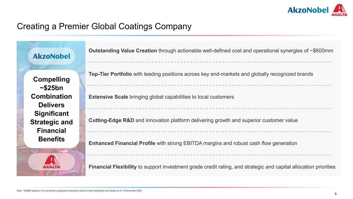 COLOR PALETTE Text 50 56 62 Creating a Premier Global Coatings Company Title bar/Bullets 0 81 146 ACCENTS 0 109 81 190 1 146 255 Outstanding Value Creation through actionable well-defined cost and operational synergies of ~$600mm 205 255 0 133 2 10 139 0 130 139 218 3 197 255 Top-Tier Portfolio with leading positions across key end-markets and globally recognized brands 246 251 137 208 Compelling 4 32 166 122 202 ~$25bn 183 227 5 66 178 Combination Extensive Scale bringing global capabilities to local customers 168 233 38 156 6 154 224 Delivers 30 146 124 213 Hyperlink Significant 153 234 0 98 Cutting-Edge R&D and innovation platform delivering growth and superior customer value Followed Strategic and 80 205 Hyperlink 117 255 Financial TABLE 50 Lines 56 Benefits 62 Enhanced Financial Profile with strong EBITDA margins and robust cash flow generation 0 Highlights 81 146 Financial Flexibility to support investment grade credit rating, and strategic and capital allocation priorities Note: ~$25Bn based on the combined unadjusted enterprise values of both AkzoNobel and Axalta as of 14 November 2025 5
