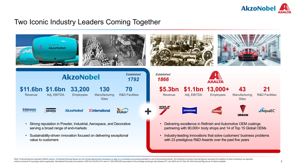COLOR PALETTE Text 50 56 62 Transaction Overview Title bar/Bullets 0 81 146 ACCENTS 0 109 ▪ AkzoNobel and Axalta to combine in all-stock merger of equals 81 190 1 146 255 ▪ Axalta shareholders to receive 0.6539 shares of AkzoNobel common shares for each Axalta common share owned 205 255 0 133 2 ▪ Prior to the completion, AkzoNobel expects to pay a special cash dividend to AkzoNobel shareholders equal to €2.5bn minus regular 10 139 dividends in 2026 Transaction 0 130 139 218 3 ▪ Pro forma ownership: 55% AkzoNobel shareholders / 45% Axalta shareholders 197 255 Structure 246 251 137 208 4 32 166▪ Strong cash flow generation and synergies supporting strategic and capital allocation priorities 122 202 ▪ Ensuring strong shareholder returns including an attractive dividend payout 183 227 5 66 178 ▪ Commitment to investment grade credit rating 168 233 Financial 38 156 6 ▪ Target net leverage ratio of 2.0-2.5x 154 224 Priorities 30 146 124 213 Hyperlink 153 234 ▪ Unanimously approved by AkzoNobel’s Board of Management and Supervisory Board and by Axalta’s Board of Directors 0 98 Followed 80 205 ▪ Subject to AkzoNobel and Axalta shareholder approval, receipt of requisite regulatory approvals, satisfaction of customary closing Hyperlink 117 255 conditions TABLE Approvals & 50▪ Transaction expected to close in late 2026 to early 2027 subject to regulatory approvals Lines 56 Closing 62 0 Highlights 81 146 ▪ Sole listing on the New York Stock Exchange following a period of dual listing on New York Stock Exchange and Euronext Amsterdam ▪ The combined company will be Netherlands domiciled Headquarters ▪ Dual-headquartered in Amsterdam and Philadelphia and Listing Note: Special Cash Dividend equals €2.5bn minus the aggregate amount of any regular annual and interim dividends paid by AkzoNobel to AkzoNobel shareholders in 2026 prior to completion 6