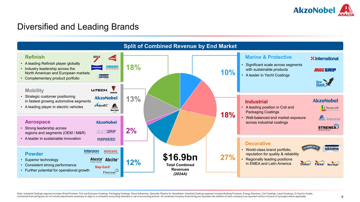 COLOR PALETTE Text 50 56 62 A Global Leader in Coatings Title bar/Bullets 0 81 146 ACCENTS 0 109 81 190 1 146 255 205 255 Decorative Paints & Other Coatings FY24A Revenue ($bn) 0 133 2 10 139 Performance Coatings 0 130 139 218 $23.1 3 197 255 246 251 137 208 4 32 166 122 202 183 227 5 $16.9 66 178 $15.8 168 233 38 156 6 154 224 30 146 $11.6 124 213 Hyperlink $10.8 153 234 0 98 Followed 80 205 Hyperlink $7.3 117 255 TABLE $5.3 $4.6 50 $3.9 Lines 56 $3.5 $3.0 62 0 Highlights 81 146 Coatings DAP #2 #3 #6 Source: Company Information Note: Combined financial figures do not include adjustments necessary to align to a consistent accounting standard or set of accounting policies. All combined company financial figures represent the addition of each company's as reported metrics inclusive of synergies where applicable 8